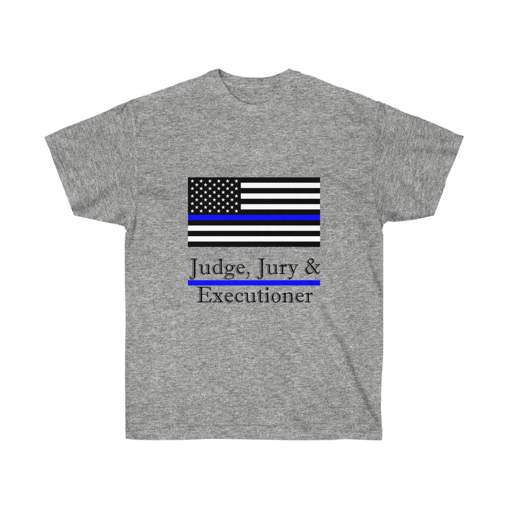 Call out the gang in blue with this sweet Thin Blue Line Flag and the text “Judge, Jury & Executioner”.
